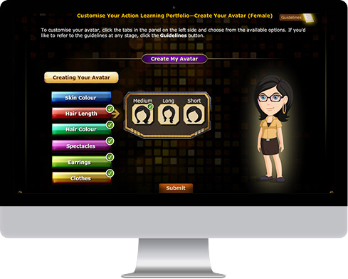 - Avatar Selection: SKILLDOM developed the functionality to select an avatar exclusively for this eLearning project. This functionality allowed learners to not only chose their avatar but also personalize it according to their choice.