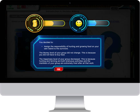 - Immersive Learning: The course that was made from the learner’s perspective had a powerful story that provided an immersive learning experience to the target audience. A number of game elements such as money and happiness meters including a number of highly engaging activities and rich graphics ensured immersive learning experience. Each decision that learners took, affected the money and happiness levels requiring learners to consider various inputs from game characters. This strategy not only succeeded in captivating the learners but also put them in close to real-life situations requiring them to apply the learning.